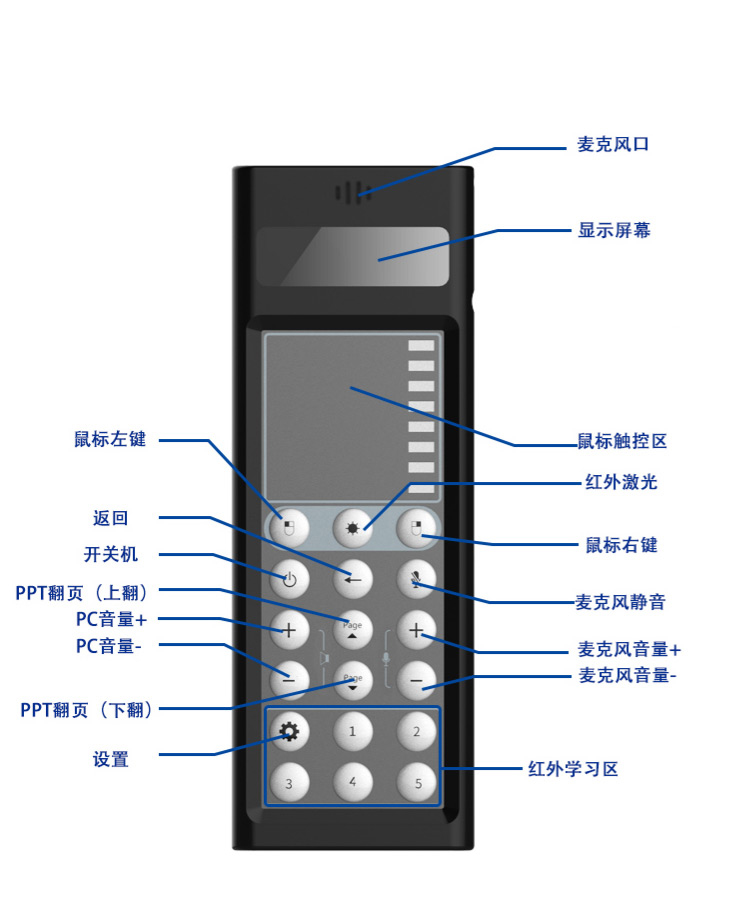自主研發(fā)集遙控器、鼠標(biāo)、麥克風(fēng)、翻頁器、激光筆于一體,支持課件翻頁、課堂擴(kuò)音等課堂操作功能,產(chǎn)品自帶鋰電池,續(xù)航時(shí)間長達(dá)8小時(shí),紅外傳輸距離可達(dá)20米。