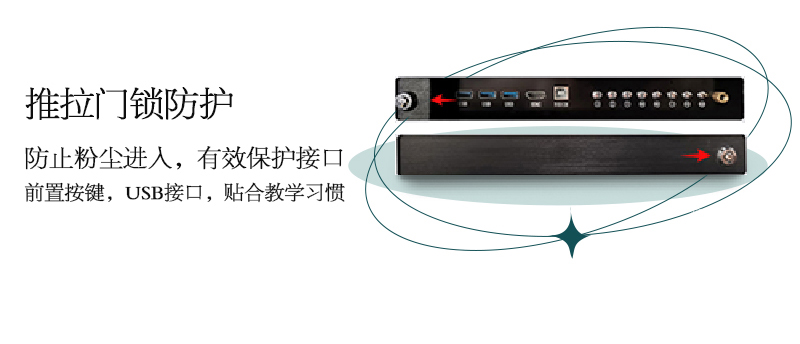 機身保護——獨特的推拉門鎖設(shè)計,保護前置按鍵及接口,還能收納白板筆和教鞭;