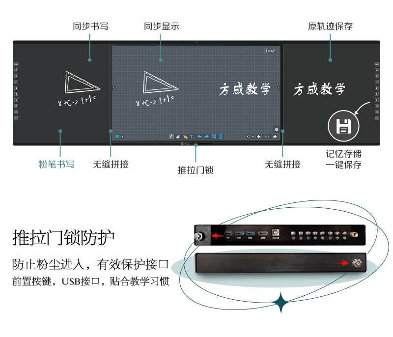 機(jī)身保護(hù)——獨(dú)特的推拉門鎖設(shè)計,保護(hù)前置按鍵及接口,還能收納白板筆和教鞭;